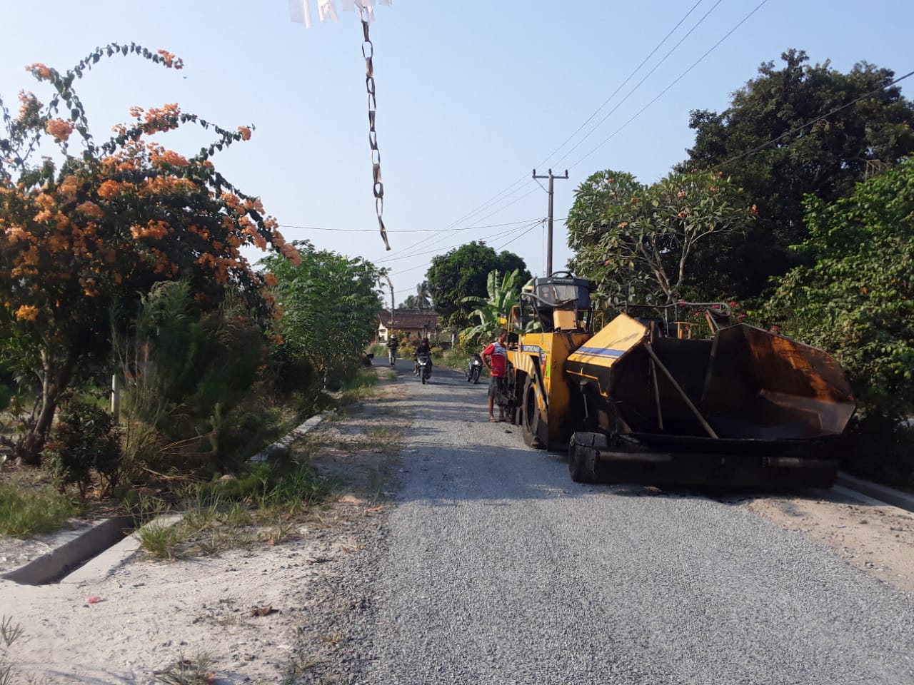 Peningkatan kualitas jalan yang merupakan wilayah Lingkungan Side Karye – Tanjung Tirto Desa Bali Agung Kecamatan Palas Kabupaten Lampung selatan di sambut gembira warga setempat, Sabtu, 2/9/2023.