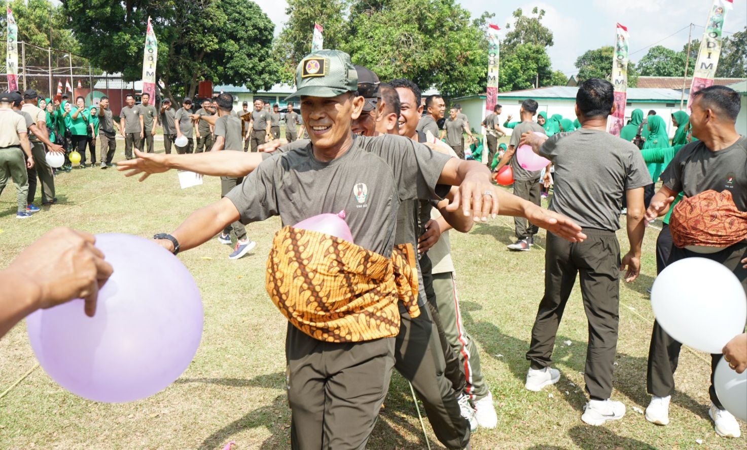 Lomba Estapet balon, estapet sarung, balap kelereng, joget balon pasangan yang diikuti oleh seluruh anggota beserta istri Bertempat di lapangan Makodim 0402/OKI, Senin (19/8/2024).